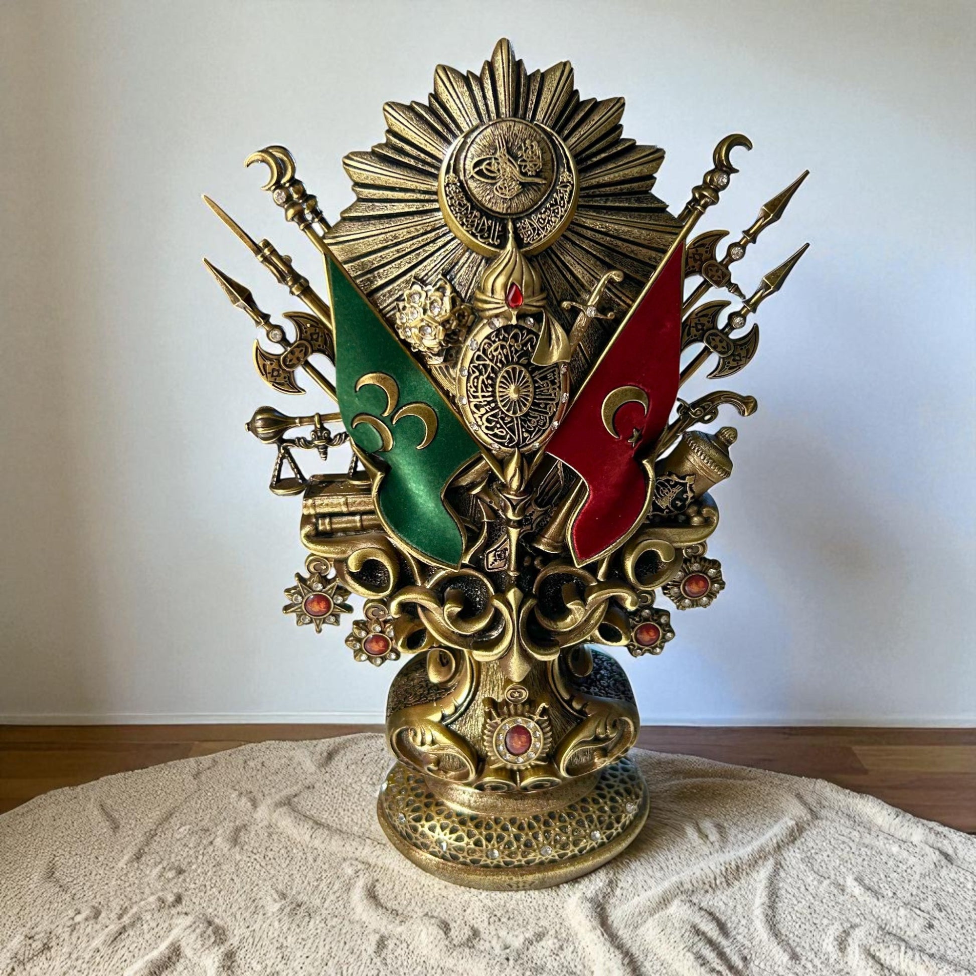 This Ottoman Empire Coat of Arms Statue is a stunning decorative figurine that reflects the deep heritage of Ottoman history and culture. Featuring the Ottoman tughra, crescent moon and star, and symbolic weapons, this elegant piece is perfect for Islamic home decor or as a meaningful cultural gift and muslim friend new office gift.